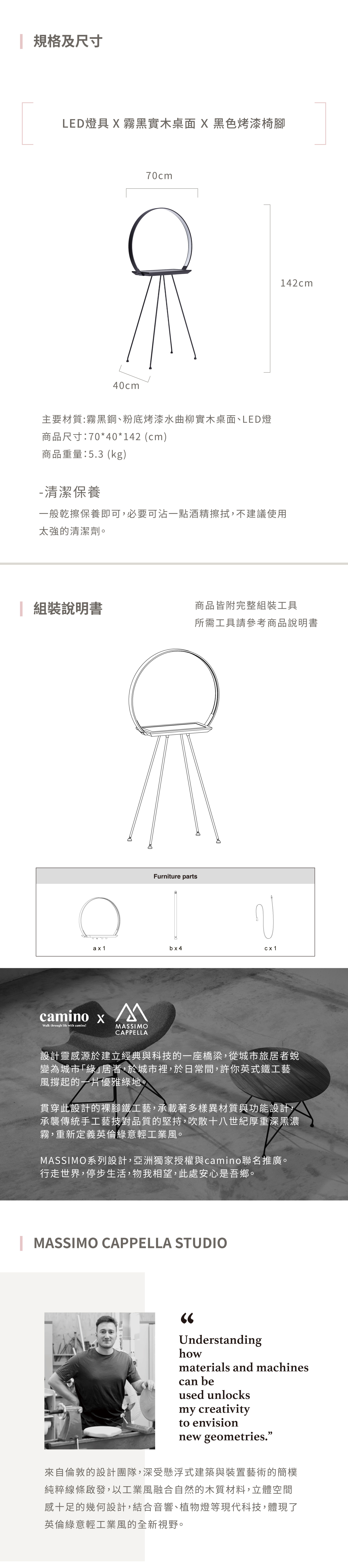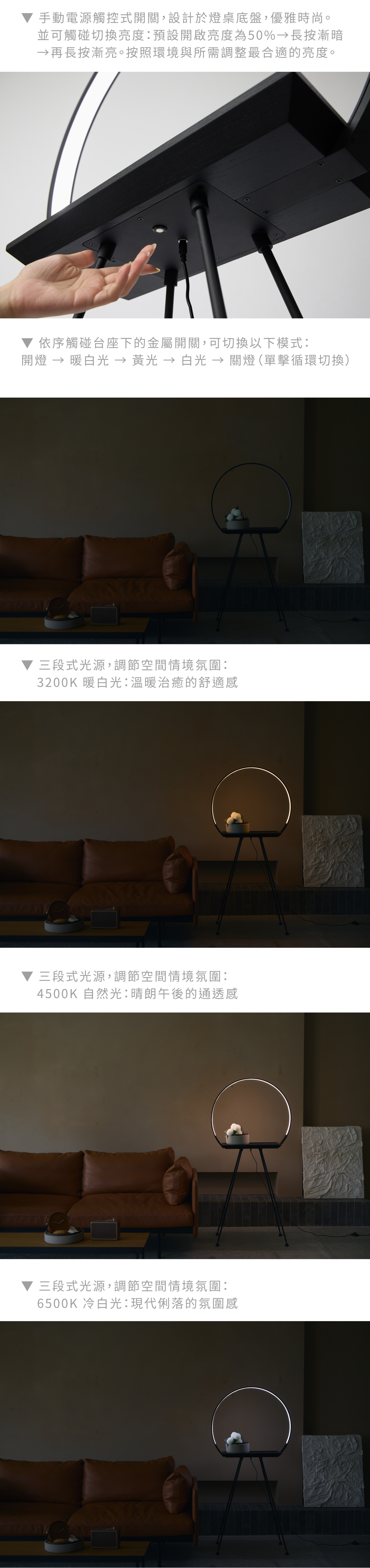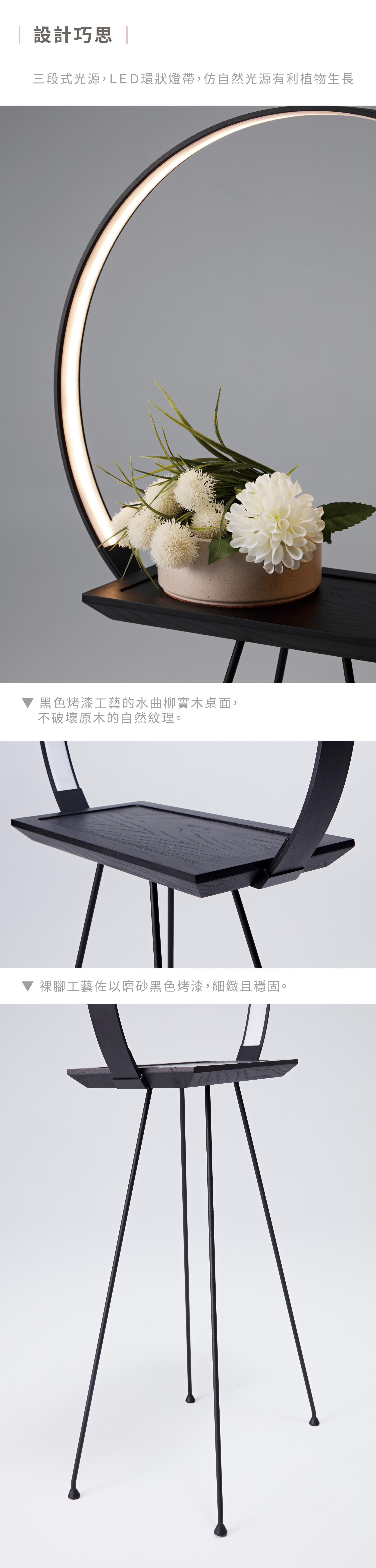 採冷光源環狀燈帶,光束不會額外產生熱能,仿自然光源有利於植物生長。裸腳工藝結構佐以磨砂黑色烤漆,細緻且穩固。