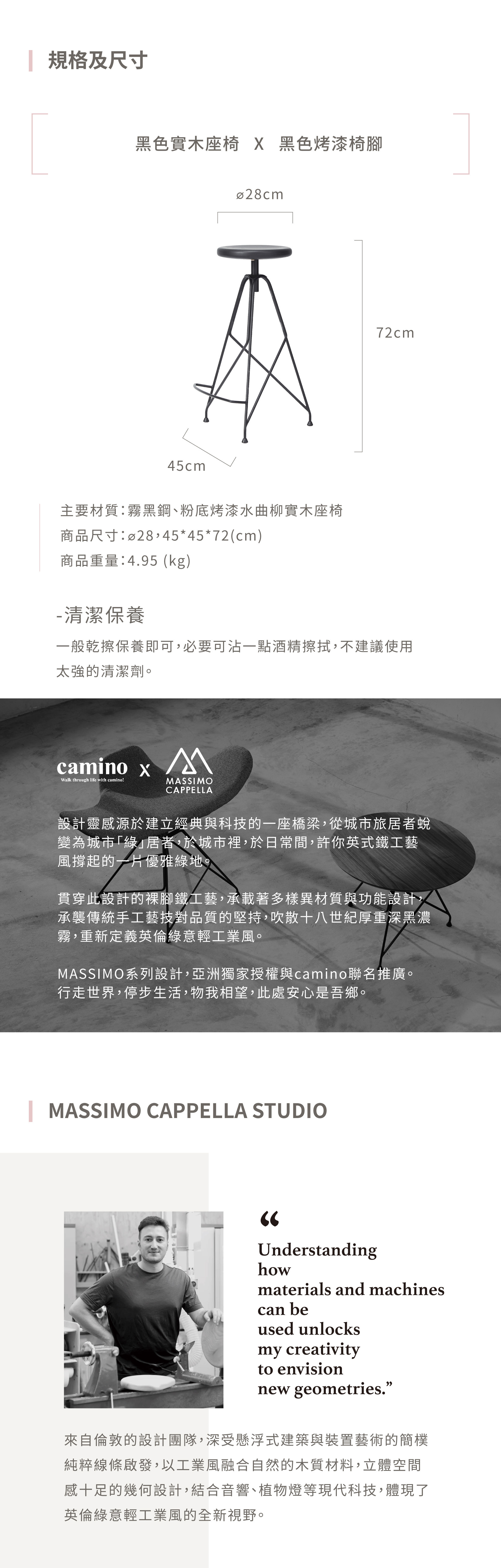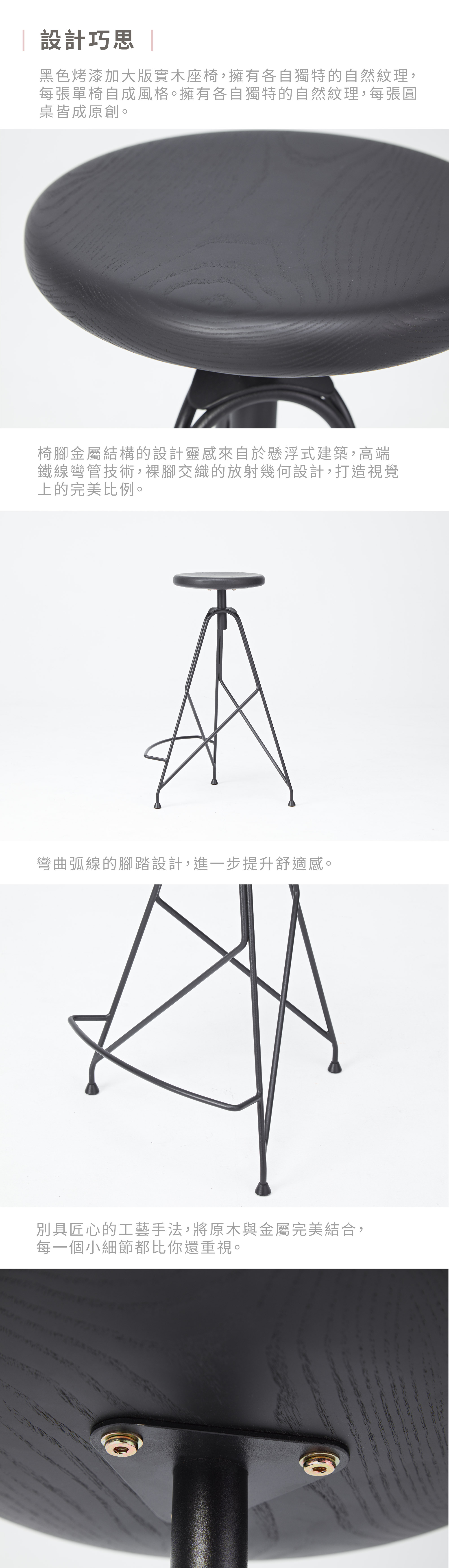 黑色烤漆的水曲柳實木座椅,與裸腳交織的放射幾何設計,打造視覺上的完美比例。彎曲弧線的腳踏設計,進一步提升舒適感。烤漆技術與打磨工藝,讓全品流淌一股低調質感黑,舉手投足,皆成風格,曖曖內含優雅,佇立即成令人深刻的存在。