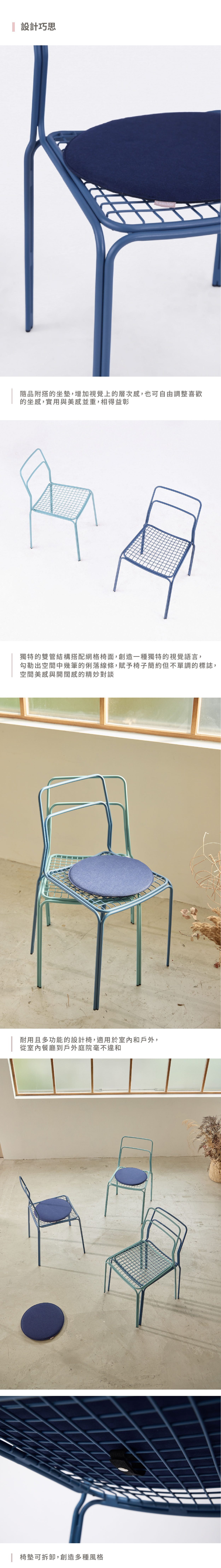 鐵線椅設計靈感汲取於購物手推車堅固且輕便的設計靈感,不僅提供輕量化,還能高效的方便堆疊。是一款耐用且多功能的設計椅,適用於室內和戶外,從室內餐廳到戶外庭院毫不違和。