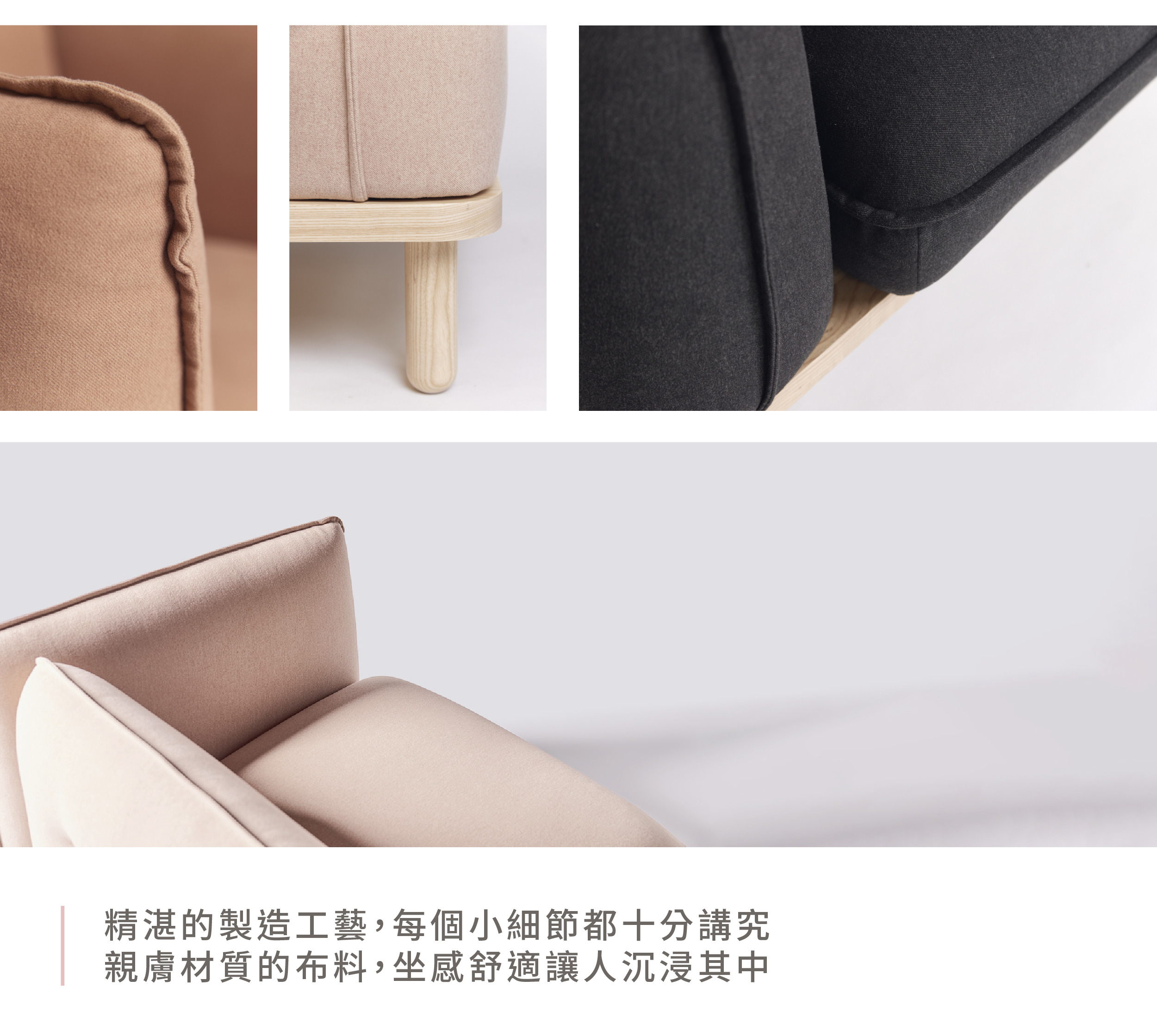 扶手側面的菱格設計,簡潔布面中帶入幾何立體感,在不同強弱光線下,可呈現出不同的視覺體驗。